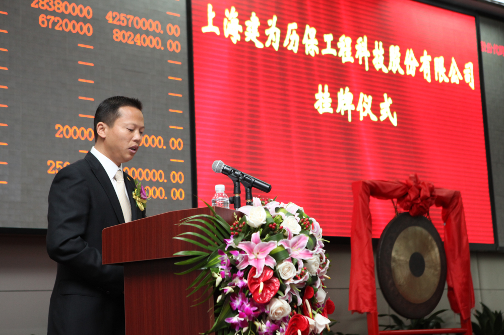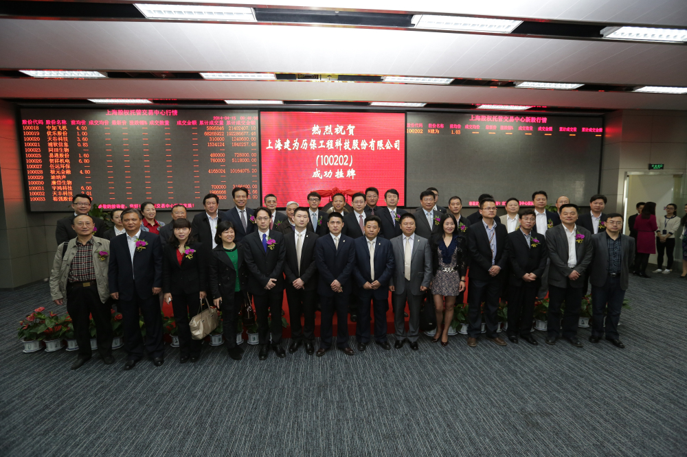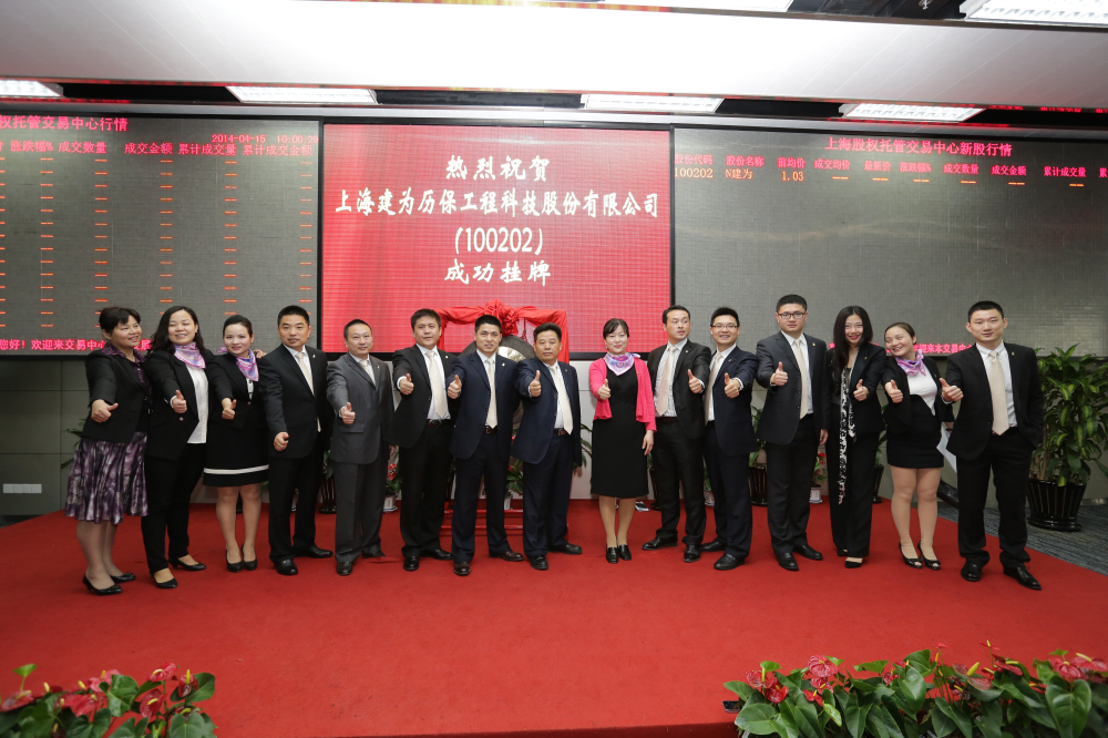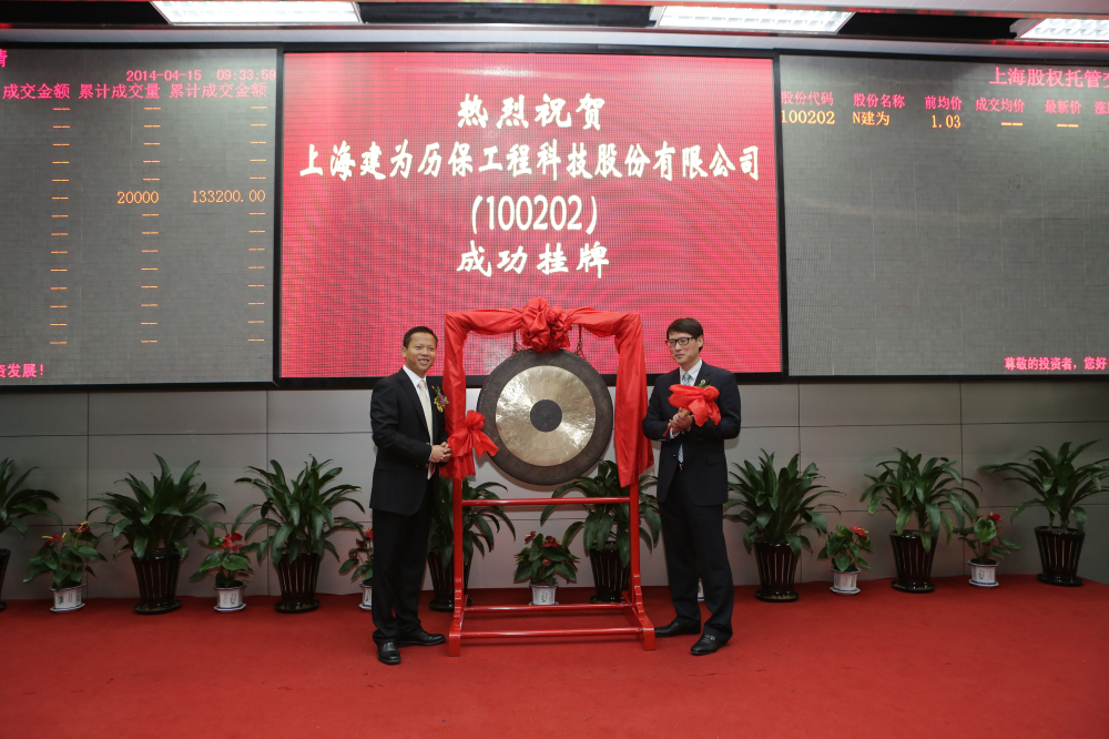 ? ? 2014年4月15日9:30,上海股权托管交易中心一楼,建为历保董事长郭伟民与上海文物局副局长褚晓波共同敲响交易所的大钟,随着这声标志着成功持牌上市的清脆铜锣声被敲响,交易大厅屏幕用红色大字显示“上海建为历保工程科技股份有限公司成功挂牌上市,股票代码100202”。这也标志着上海建为历保工程科技股份有限公司(简称建为历保)在上海股权交易中心成功挂牌上市。