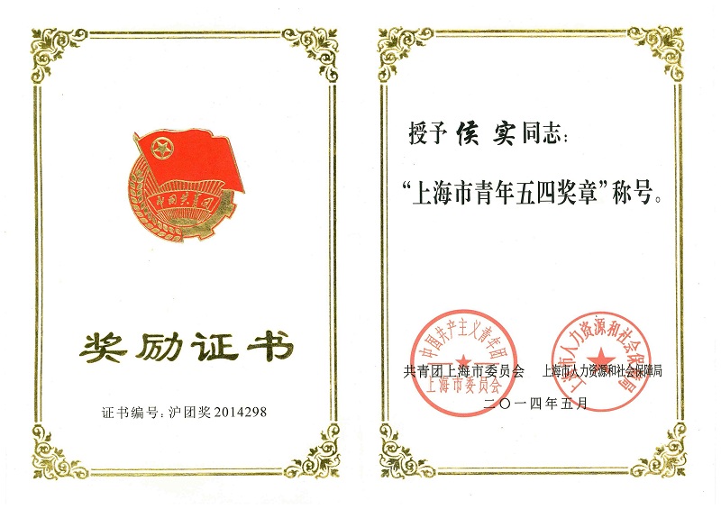 我司侯实博士荣获2014年度“上海市青年五四奖章”荣誉称号