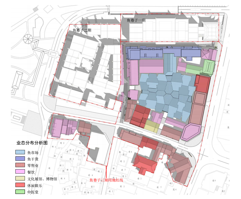 ? ? ? ?鱼巷子改造工程将综合打造鱼巷子街区,在保留原有区域内的渔业相关业态的基础上,对街区进行活化、优化、美化。将原有鲜活鱼业转移到改建综合市场内,外部转为鱼干货贩卖,进行干湿分离;并且在这个基础上引入文化展览展示、旅游服务、休闲娱乐、饮食等业态,进行合理、适度的旅游业开发转变。