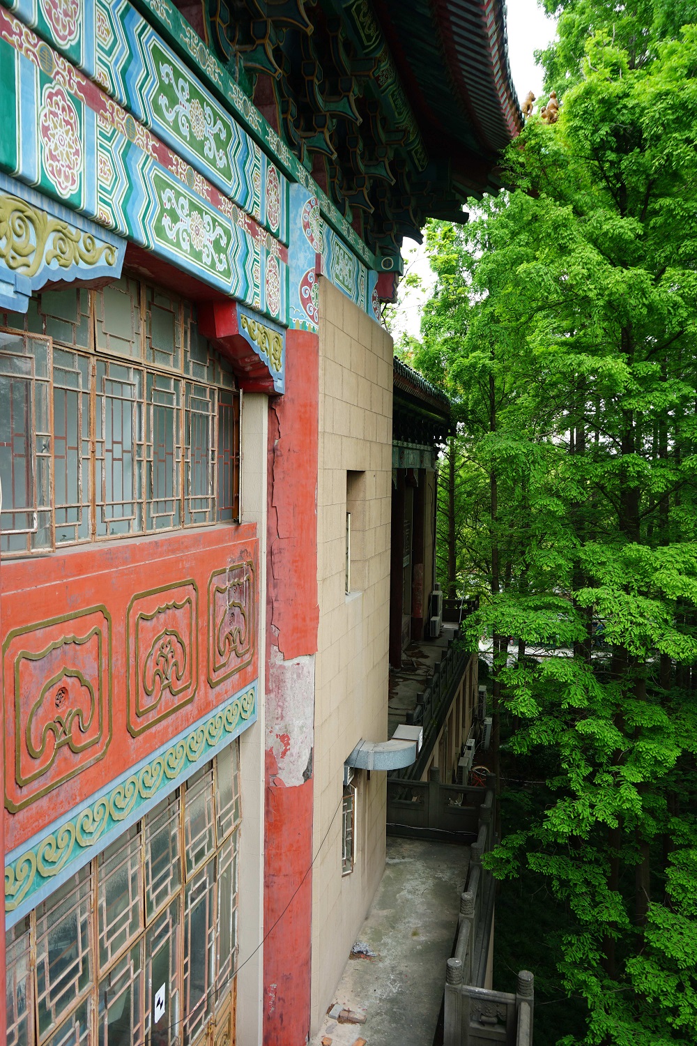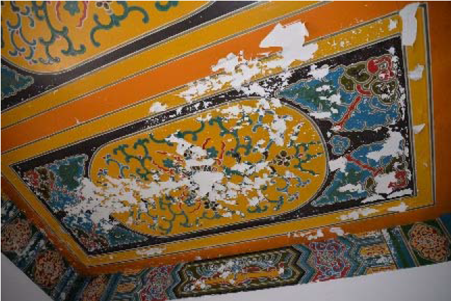 岁月流逝,自1932建成至今,绿瓦大楼已经历了85年风风雨雨,不可避免的出现了很多病害和损伤。外墙面开裂、污染;室外栏杆被植物青苔覆盖;铁门窗油漆剥落,五金件锈蚀;地面残损;彩绘不同程度的剥落等。